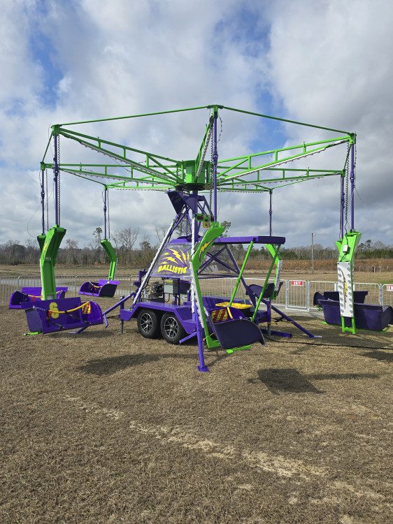 Go Ballistic! DMJ's Ballistic Swing carnival ride will have you spinning out and defying gravity as it turns the seats at a near 45 degree angle at full speed through the air.